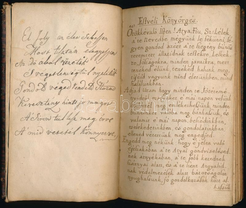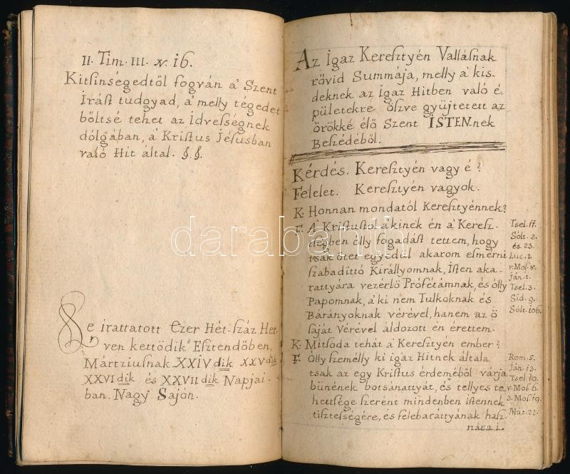 cca 1761-1772 Magyar nyelven, szép kéz írással írt vallási könyvecske, részben imádságokkal, részben kérdés-feleletes káté. Két évszám bejegyezve, az egyik az elején, 1761. június 9., 1772. március 24.-27., Nagysajó. Korabeli kopottas egészbőr kötés, korának megfelelő állapotban, 36 sztl. lev.