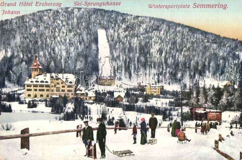Leírás: Semmering, Wintersportplatz, Grand Hotel Erzherzog, Ski-Sprungschanze, Johann / hotel, winter sport place, ski jumping hill, sledding people