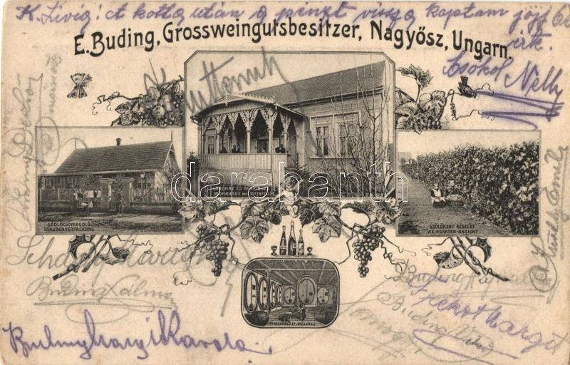 Nagyősz, Triebswetter, Tomnatic; E. Buding, Grossweingutsbesitzer, Traubenverpackung, Wohnhaus mit Weinkeller, Weingarten, Kellerei / Buding Ede szőlőnagybirtokos, szőlészet, lakóház és borpince, szőlőcsomagoló, szőlőkert, pincerészlet, belső / winery, grape packing, wine cellar and garden, interior, floral Art Nouveau (EK)