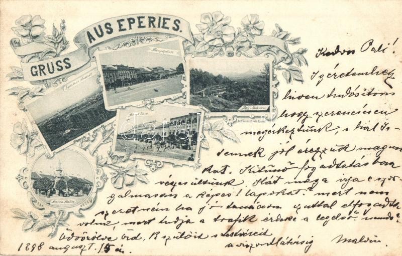 1898 Eperjes, Presov; Hauptplatz, Hauptgasse, Petőfi Gedenkm., Maria Statue / Fő tér, Fő utca, Petőfi emlék, szobor, Divald kiadása / main square, main street, monuments, memorial, floral Art Nouveau (EK)
