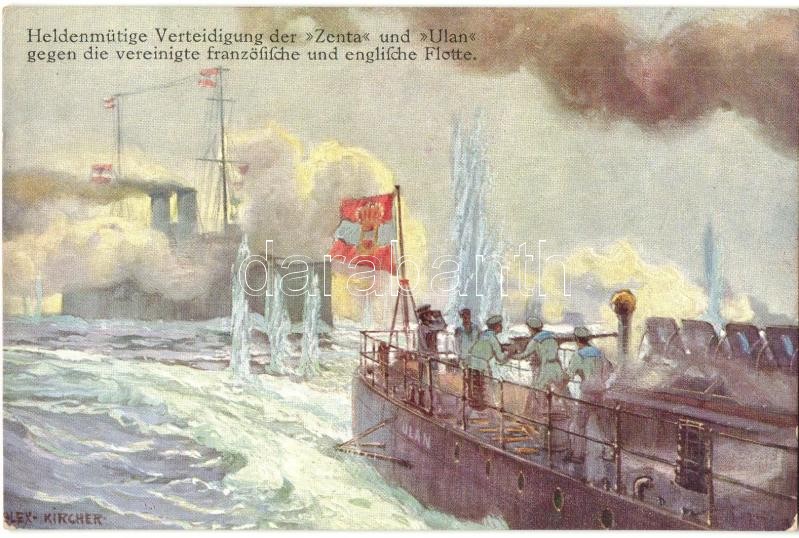 Heldenmütige Verteidigung der Zenta und Ulan gegen die vereinigte französische und englische Flotte. Offizielle Postkarte des Österr. Flottenvereines zugunsten der Kriegsfürsorge / K.u.K. Kriegsmarine art postcard, SMS Zenta and SMS Ulan s: Alex Kircher