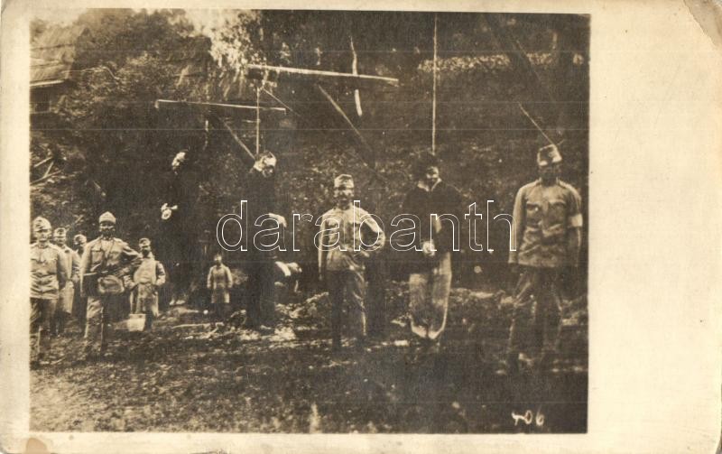 Leírás: Toronya, Torun; Osztrák-magyar katonák 'oroszbarát kémeket' akasztanak / Austro-Hungarian K.u.K. soldiers executing "Russophiles", hanging, photo (EK)