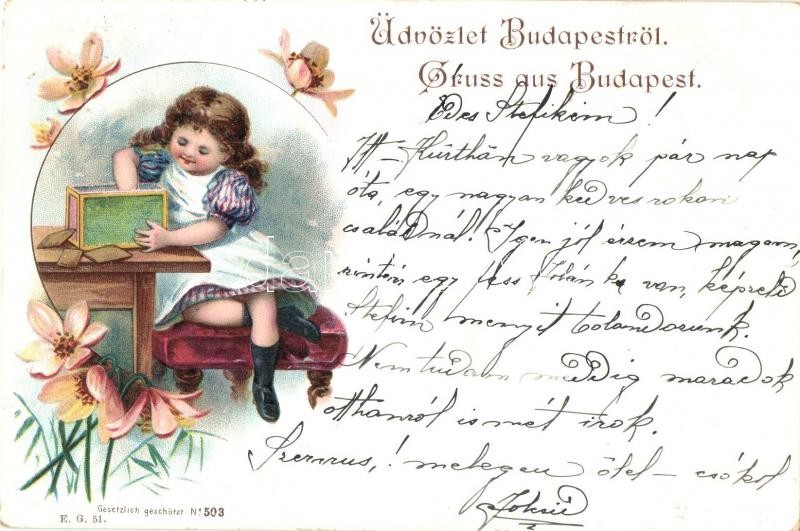 Leírás: 1899 Budapest, Üdvözlőlap kislánnyal, floral, litho (EK)