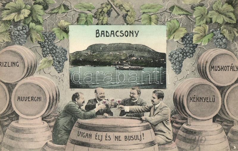 Leírás: Badacsony, 'Vígan élj és ne búsulj!', boros hordók, szőlő, látkép gőzhajóval, Löwy B. kiadása (lyuk / pinhole)