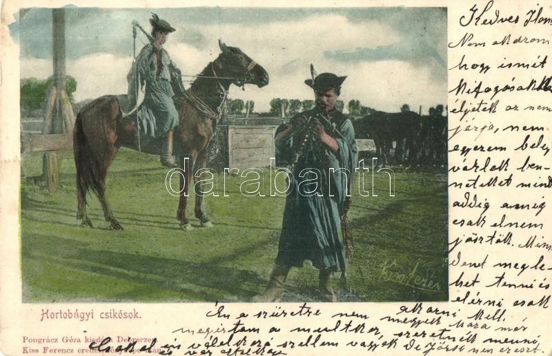 Leírás: Hortobágy, csikósok, Kiss Ferencz eredeti fényképe után, Pongrácz Géza kiadása (EK)