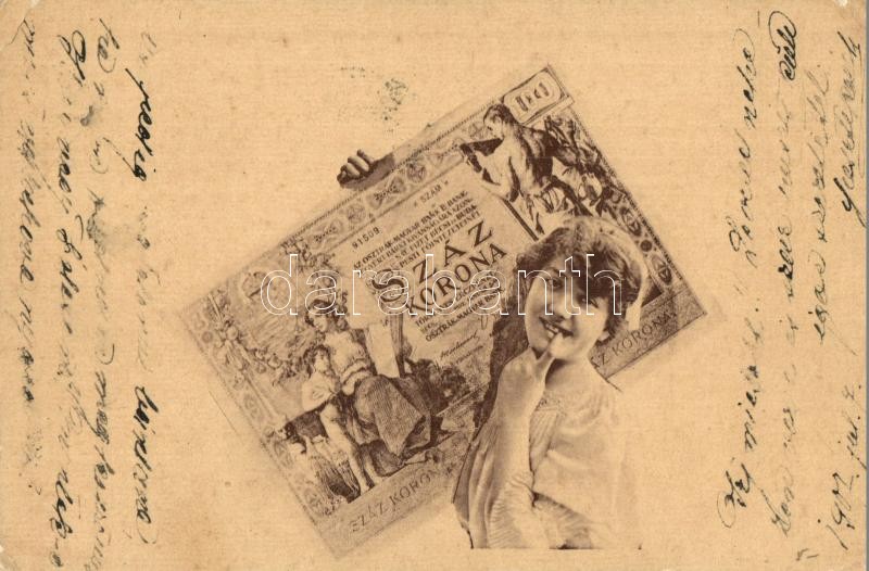 Száz korona / Hungarian banknote with lady (EK) https://www.darabanth.com/hu/294-Gyorsarveres/294.0/Kepeslapok/Numizmatika~100073/Szaz-korona-Hungarian-banknote-with-lady-EK~II1561460
