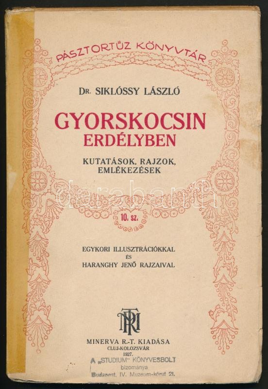 Siklóssy László: Gyorskocsin Erdélyben. Kutatások, rajzok, emlékezések. Egykori illusztrációkkal és Haranghy Jenő rajzaival. Cluj-Kolozsvár, 1927, Minerva Irodalmi és Nyomdai Műintézet (Pásztortűz könyvtár 10.). Kiadói papírkötésben, javított gerinccel.