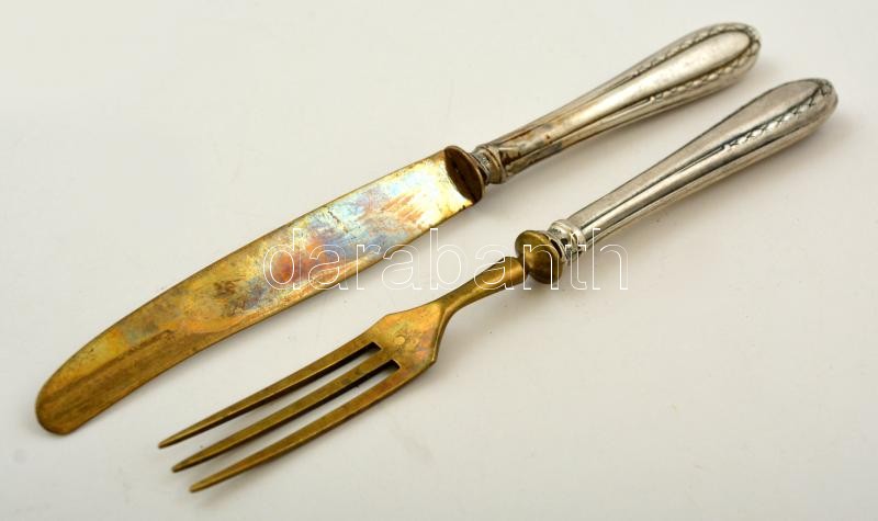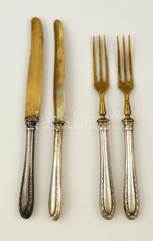 Leírás: Ezüst(Ag) nyelű kés(2 db) + ezüst(Ag) nyelű villa(2 db), jelzettek: h: 16 és 17 cm, bruttó: 76 g