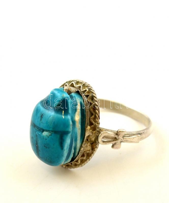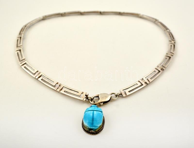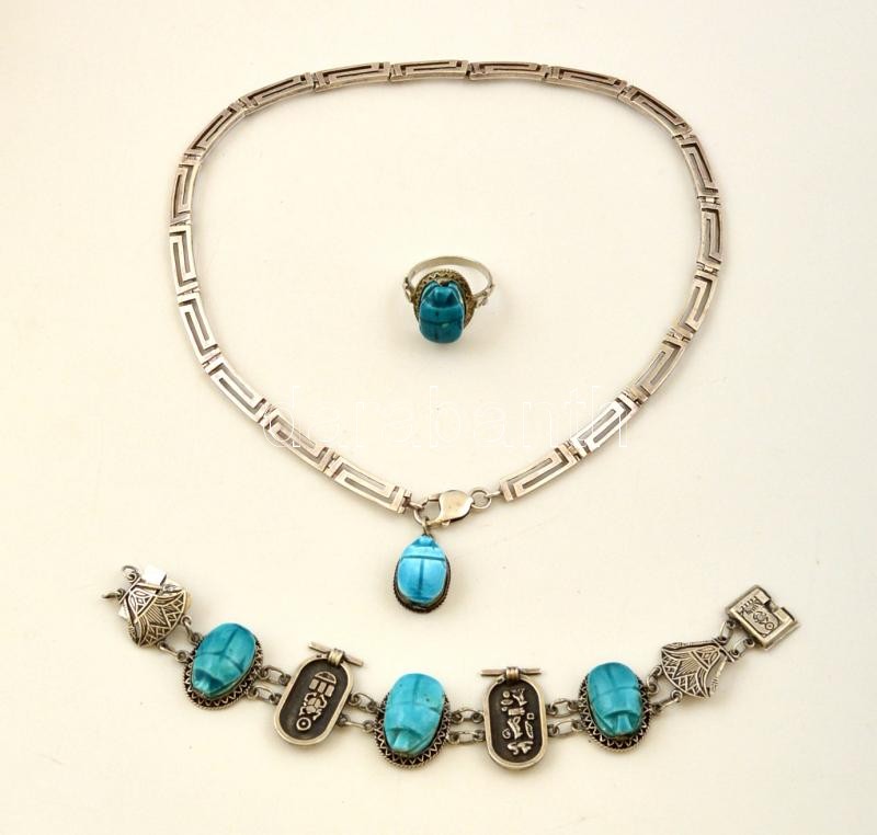 Szkarabeuszmotívumos ezüst (Ag.) ékszer szett: gyűrű, nyaklánc, karkötő, kő berakásokkal, jelzettek, gyűrűméret: 63, h: 21 ill. 44 cm, összesen bruttó 64,5 g