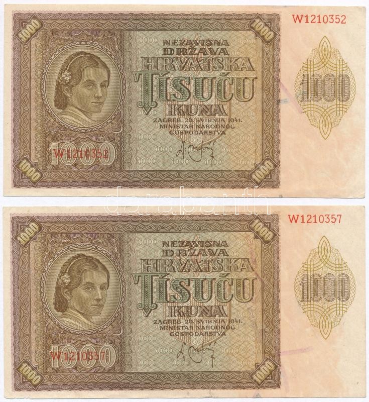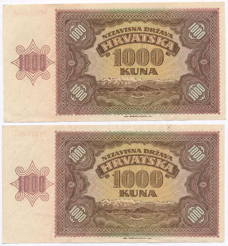 Független Horvát Állam 1941. 1000K (2x) közeli sorszám T:I-,II hajtatlan, egyiken kis szakadások a széleken