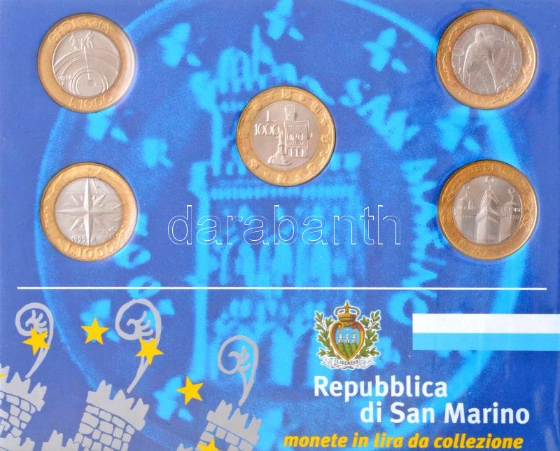San Marino 1997-2001 1000L (5xklf) forgalmi emlékérmék gyűjtői lapon, ... https://www.darabanth.com/hu/294-Gyorsarveres/294.0/Numizmatika/Kulfoldi-fem-es-ezustpenzek~400013/San-Marino-1997-2001-1000L-5xklf-forgalmi-emlekermek-gyujtoi-lapon-ketgyurus-mappaban-T~II1558411