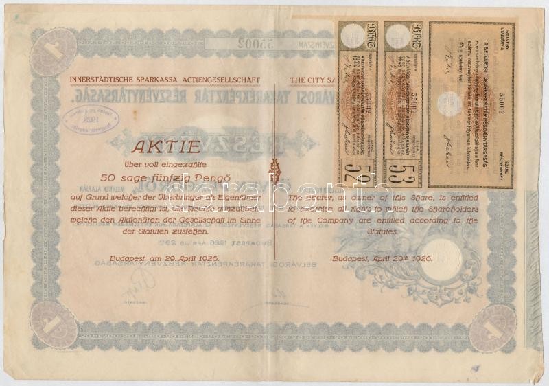 Leírás: Budapest 1926. "Belvárosi Takarékpénztár Részvénytársaság" részvénye 50P-ről, szárazpecséttel, bélyegzéssel és szelvényekkel T:II-,III