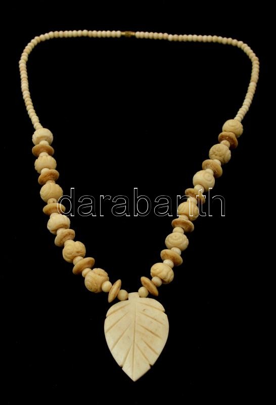 Leírás: Csont nyaklánc, faragott medállal, h: 44 cm