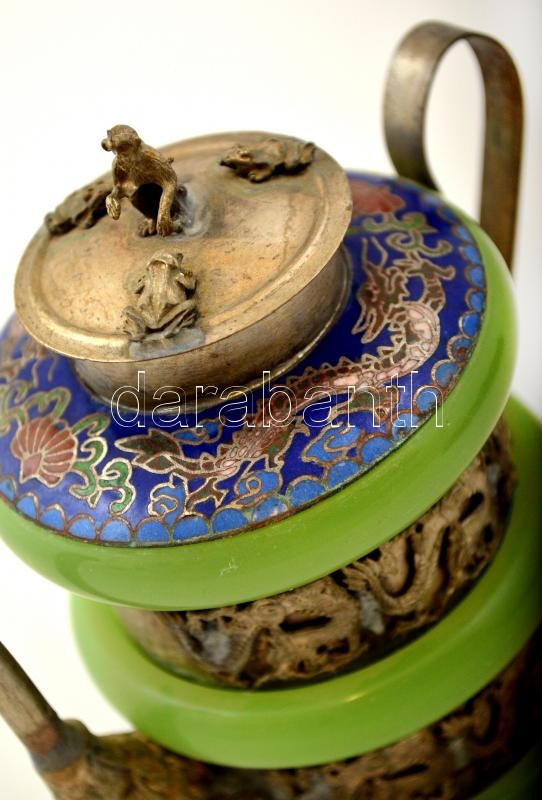 Leírás: Jádéval és rekeszzománccal díszített fém teáskanna, tetején apró majomfigurával, m: 12 cm