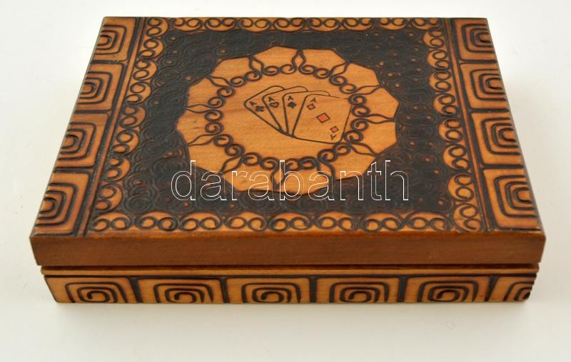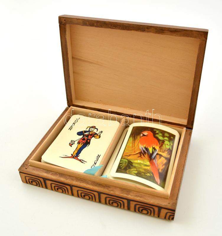 Leírás: Papagájos römikártya díszes fa dobozban