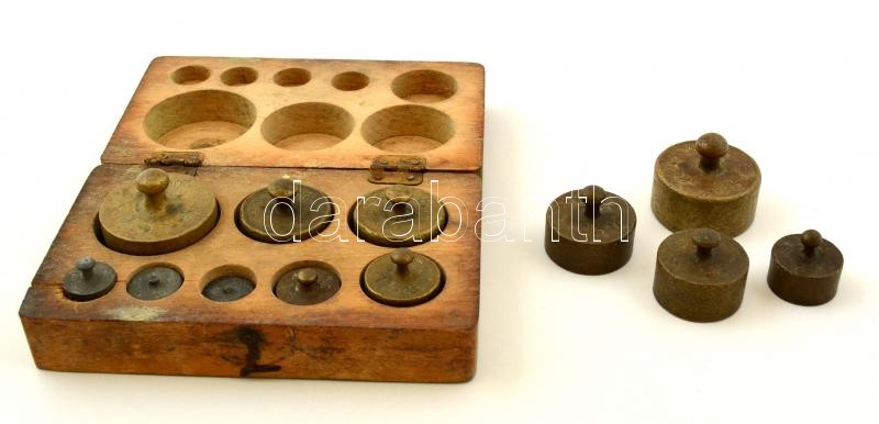 Leírás: Régi súlykészlet, fa dobozban, néhány sérült, pót darabokkal ( 4db)