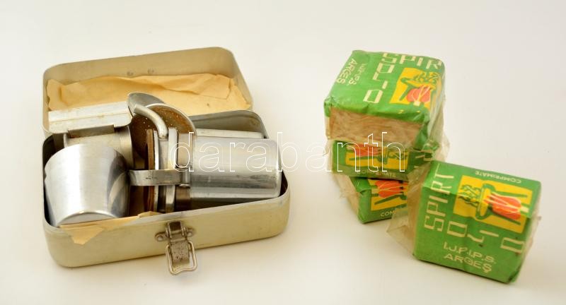 Leírás: Sport Presso retró kávéfőzőkészlet (Fémfeldolgozó Szeged), hiánytalan, 4 db bontatlan spiritusz tablettával, 14x9x6 cm