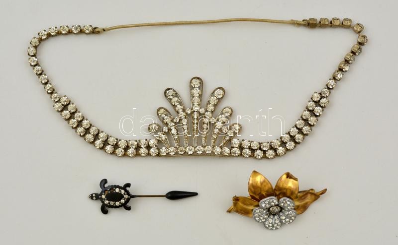 Leírás: Strasszokkal kirakott nyakék + bross + kalaptű (hiányos berakással), 3 db