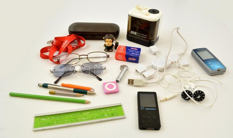 Leírás: Vegyes bolha tétel (ceruzahegyező, vércukorszintmérő, pendrive, mp3 lejátszó, szemüvegek, szemüvegtok, fülhallgató, stb.)