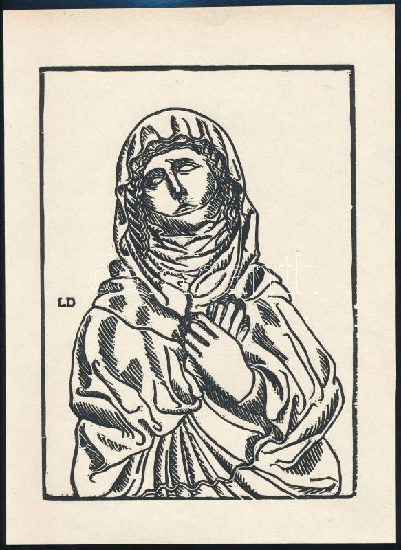 LD jelzéssel: Mária. Fametszet, papír, 23x16 cm https://www.darabanth.com/hu/295-Gyorsarveres/295.0/Festmeny-mutargy-papirregiseg-egyeb/Festmenyek-es-grafikak~500018/LD-jelzessel-Maria-Fametszet-papir-23x16-cm~II1569791