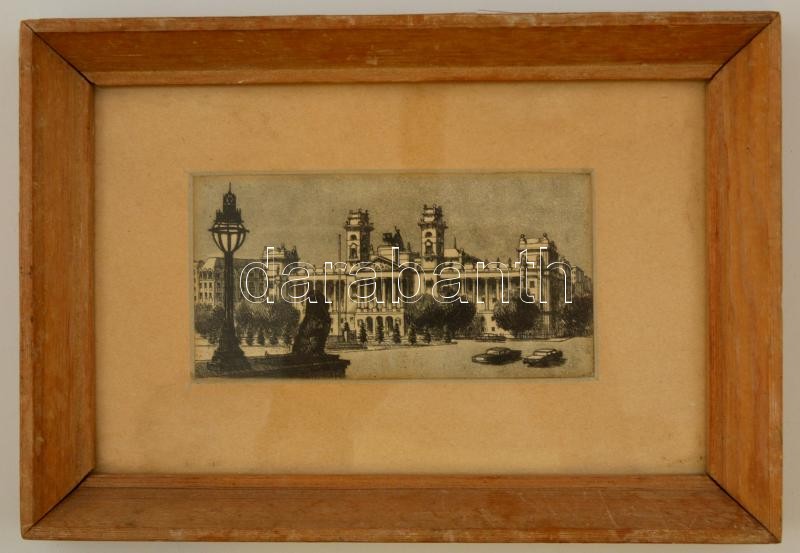 Leírás: Vertel József (1922-1993):Szabadságtér. Rézkarc, papír, jelzés nélkül, üvegezett keretben, 7×13,5 cm