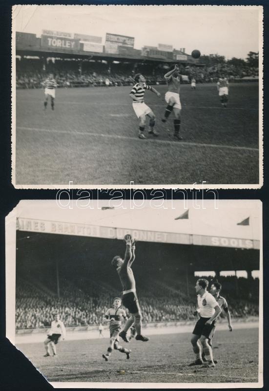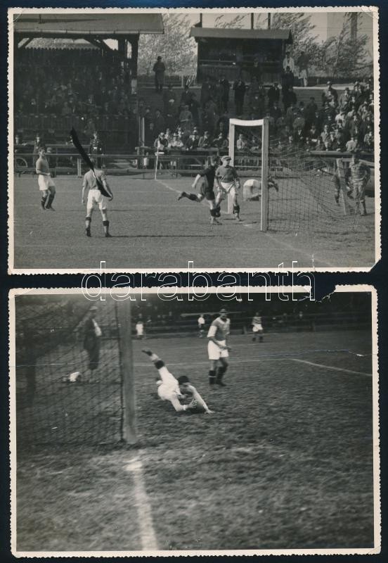 Leírás: Labdarúgók hazai és külföldi mérkőzéséken, 4 db fotó, törésnyomokkal, szakadásokkal, hiányokkal, 13x18 cm