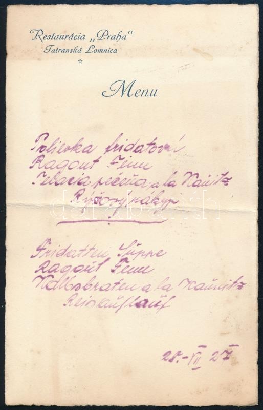 1928 Tatranská Lomnica... https://www.darabanth.com/hu/295-Gyorsarveres/295.0/Festmeny-mutargy-papirregiseg-egyeb/Nyomtatvanyok~200030/1928-Tatralomnic-Praha-etterem-menukartya-----1928-Tatranska-Lomnica-Restauracia-Praha-me~II1565693