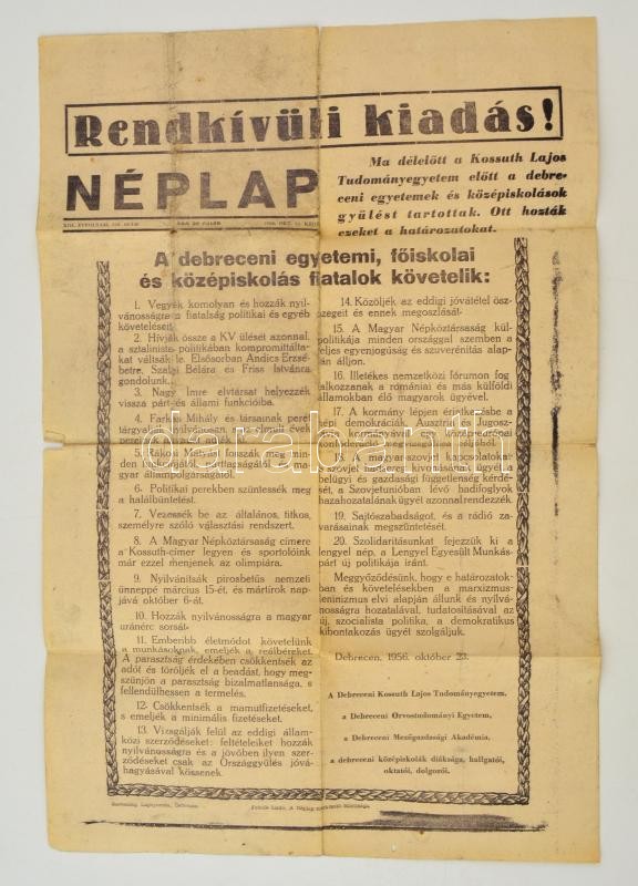 1956 Néplap Rendkívüli kiadás!, 1956. október 23., XIII. évf. 250. szá... https://www.darabanth.com/hu/295-Gyorsarveres/295.0/Festmeny-mutargy-papirregiseg-egyeb/Nyomtatvanyok~200030/1956-Neplap-Rendkivuli-kiadas-1956-oktober-23-XIII-evf-250-szam-Szabadsag-Lapnyomda~II1572502