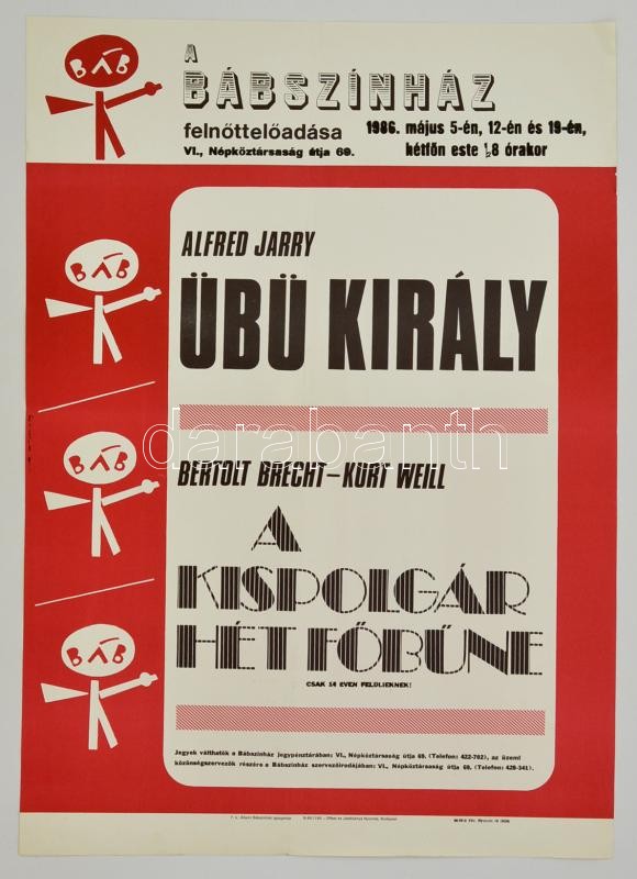 1986 A Bábszínház felnőtt előadásainak plakátja, Alfred Jarry: Übü Kir... https://www.darabanth.com/hu/295-Gyorsarveres/295.0/Festmeny-mutargy-papirregiseg-egyeb/Plakat~200031/1986-A-Babszinhaz-felnott-eloadasainak-plakatja-Alfred-Jarry-Ubu-Kiraly-Brecht-Weill-A~II1567418
