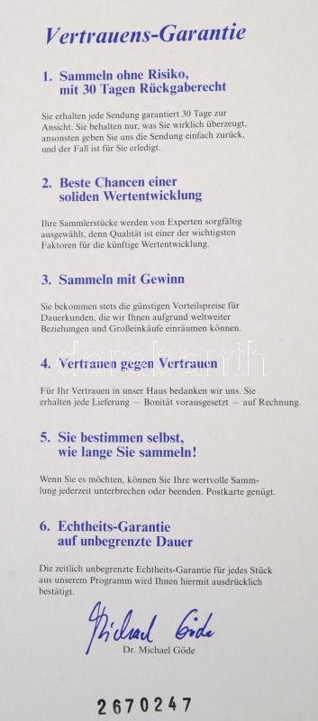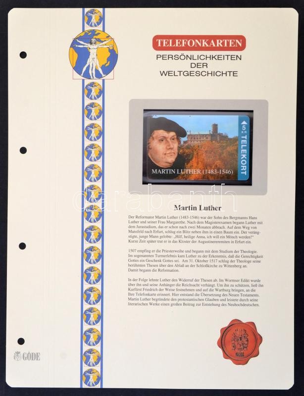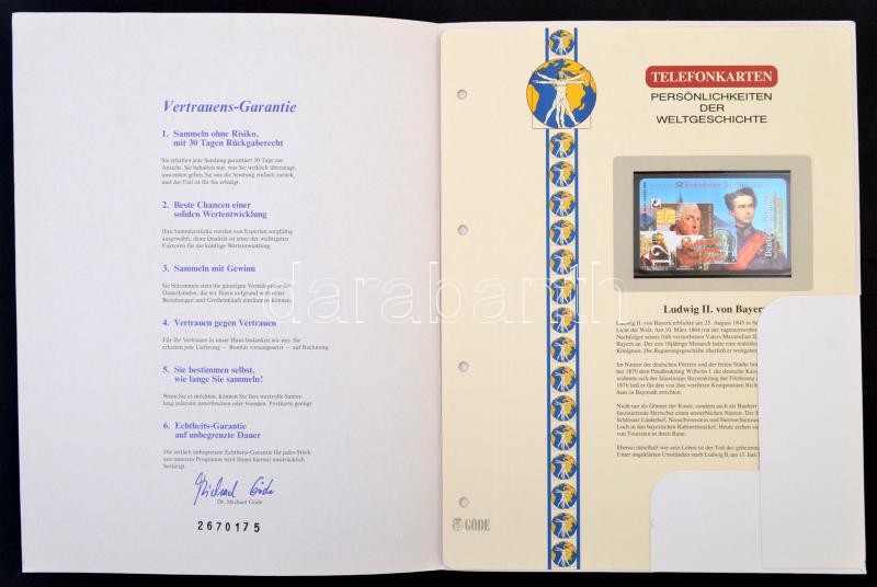 "Persönlichkeiten der Weltgeschichte, különféle híres személyiségeket felvonultató német telefonkártya-gyűjtemény, mappákba rendezve, összesen 21 db, mind sorszámozott, leírással, jó állapotban