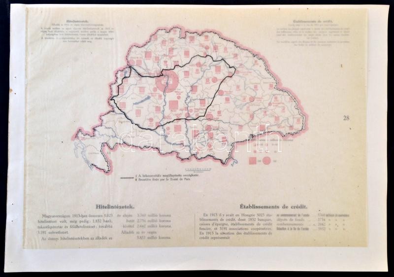 cca 1920 Hitelintézetek Magyarországon / Établissements de crédit en Hongrie, a "Magyarország gazdasági térképekben" kiadványból, magyar és francia magyarázó szöveggel, a trianoni határok feltüntetésével, 26,5×37,5 cm