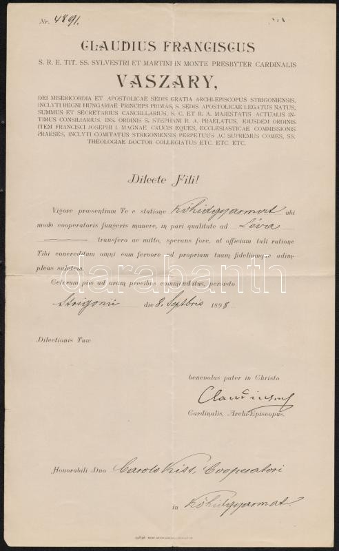 1898 Vaszary Kolos (1832-1915) bíboros saját kézzel aláírt levele Kiss Károly (1873-1935) részére, melyben felmenti a felvidéki kőhídgyarmati plébánosi tisztségéből és áthelyezi Lévára