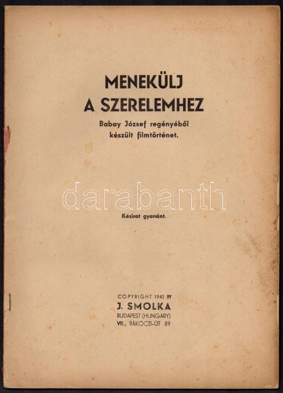 Leírás: 1940 Menekülj a szerelemhez. Babay József regényéből készült filmtörténet. Kézirat gyanánt, Bp., J. Smolka. Tűzött papírkötésben, jó állapotban.