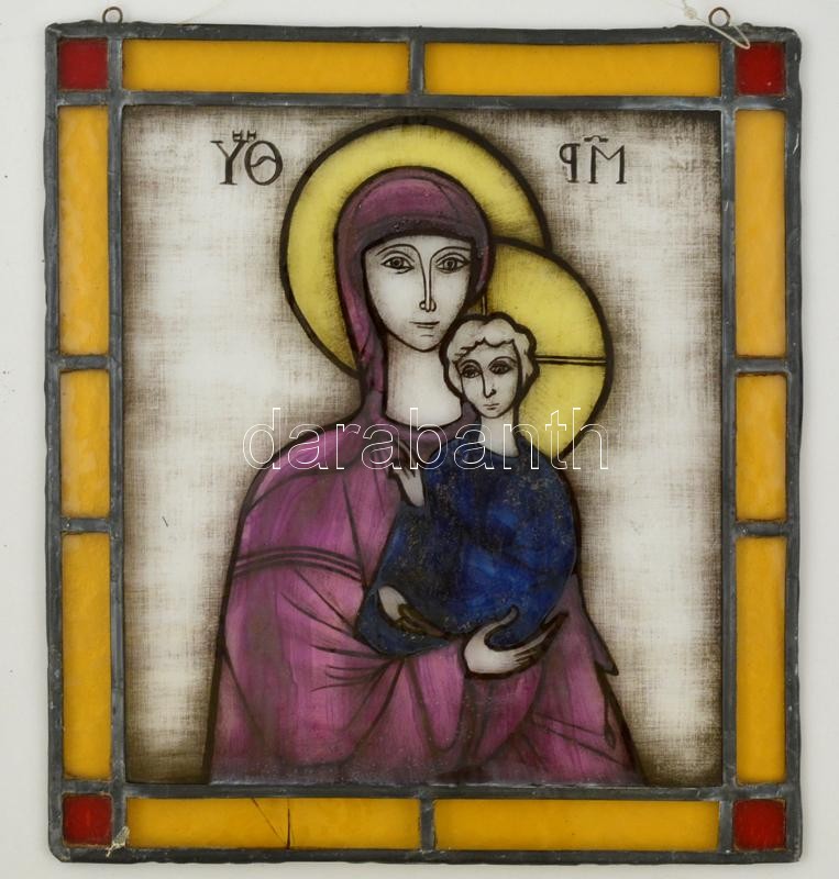 Leírás: Mária a gyermek Jézussal, ólomüveg ikon, kézzel festett, repedéssel, 38x34 cm