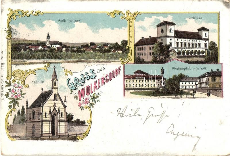 Leírás: Wolkersdorf, Schloss, Kapelle, Kirchenplatz, Schule / castle, chapel, church square, school. Franz Baar's Floral, Art Nouveau litho (cut)