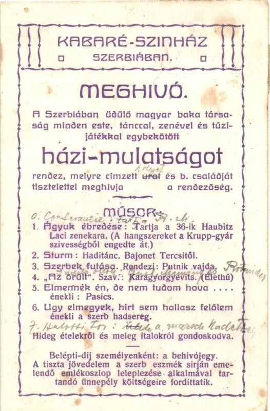 Kabaré Színház Szerbiában. Meghívó a bakák házi-mulatságára. Kiadja Ta... https://www.darabanth.com/hu/295-Gyorsarveres/295.0/Kepeslapok/Katonai~80/Kabare-Szinhaz-Szerbiaban-Meghivo-a-bakak-hazi-mulatsagara-Kiadja-Takacs-Marcell-WWI-~II1568448