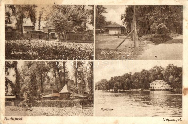 Leírás: Budapest IV. Népsziget, Hantis és Indián csónakház, teniszpálya, vízi házak. Özv. Bárczay Oszkárné kiadása (EK)