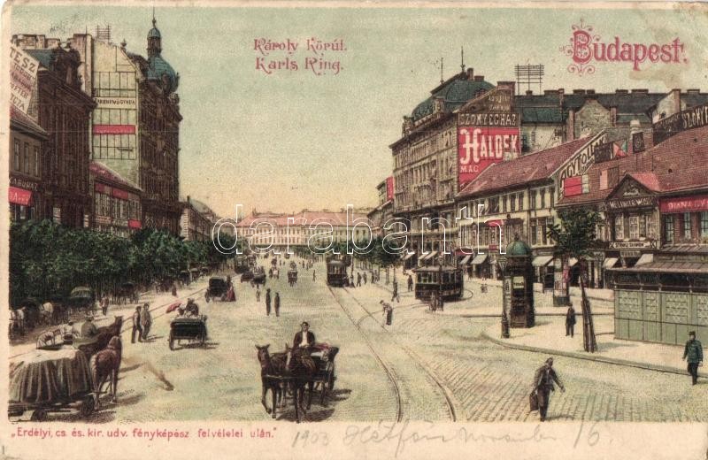 Budapest V. Károly körút, villamosok, Haldek szőnyegház, Wellinger és Weiss, Strausz üzletei, Erdélyi felvételei után, litho (kis szakadás / small tear)