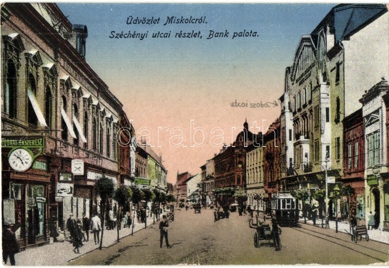 Miskolc, Széchenyi utca, Bank palota, villamos, órás és ékszerész üzle... https://www.darabanth.com/hu/295-Gyorsarveres/295.0/Kepeslapok/Magyarorszag~5/Miskolc-Szechenyi-utca-Bank-palota-villamos-oras-es-ekszeresz-uzlet-fl~II1572099