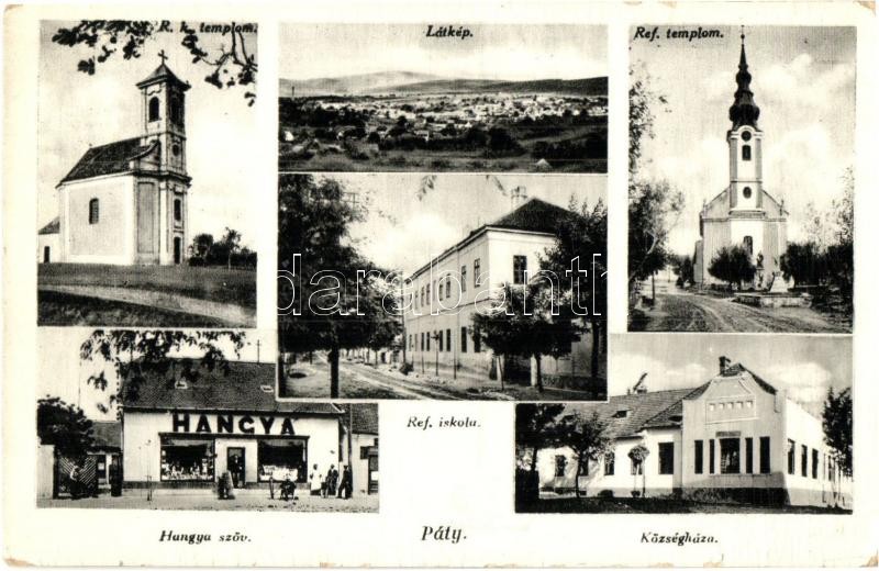 Leírás: Páty, Református templom és iskola, Községháza, Hangya fogy. szövetkezet üzlete és saját kiadása (EK)