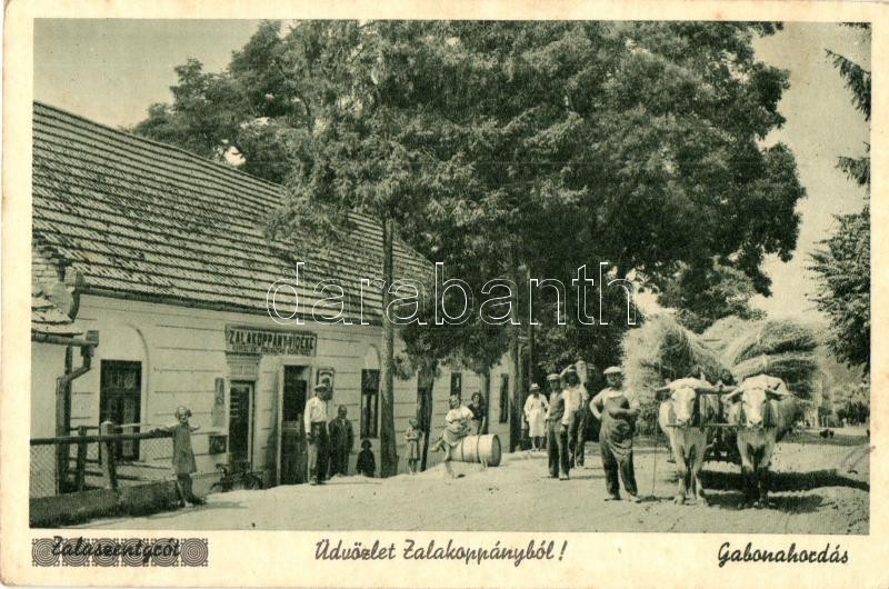 Leírás: Zalakoppány, Zalaszentgrót; utcakép gabonahordó ökrös szekerekkel, fogyasztási szövetkezet (Rb)