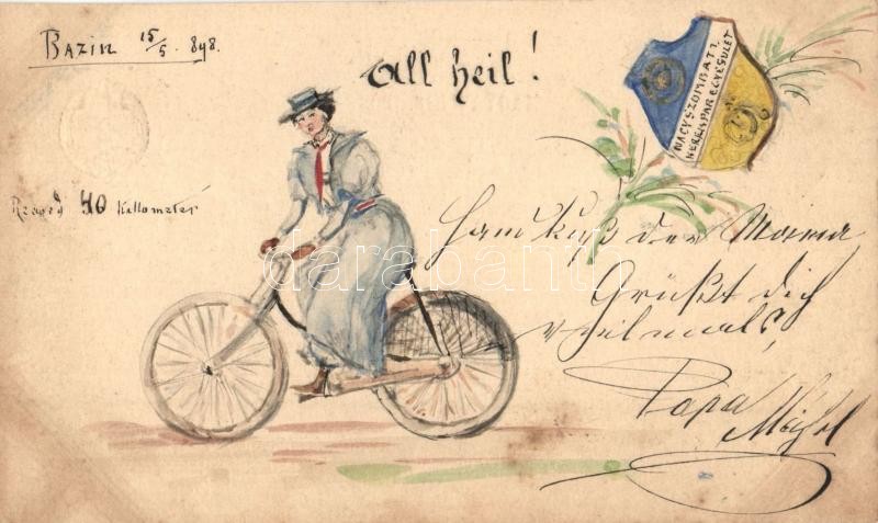 Leírás: 1898 All Heil!, Radfahrer / kézzel rajzolt biciklis üdvözlőlap, Nagyszombati kerékpáregyesület, címer / hand-drawn greeting card with cyclist lady, Trnava bicycle club, coat of arms, 2 Kr Ga. (EK)