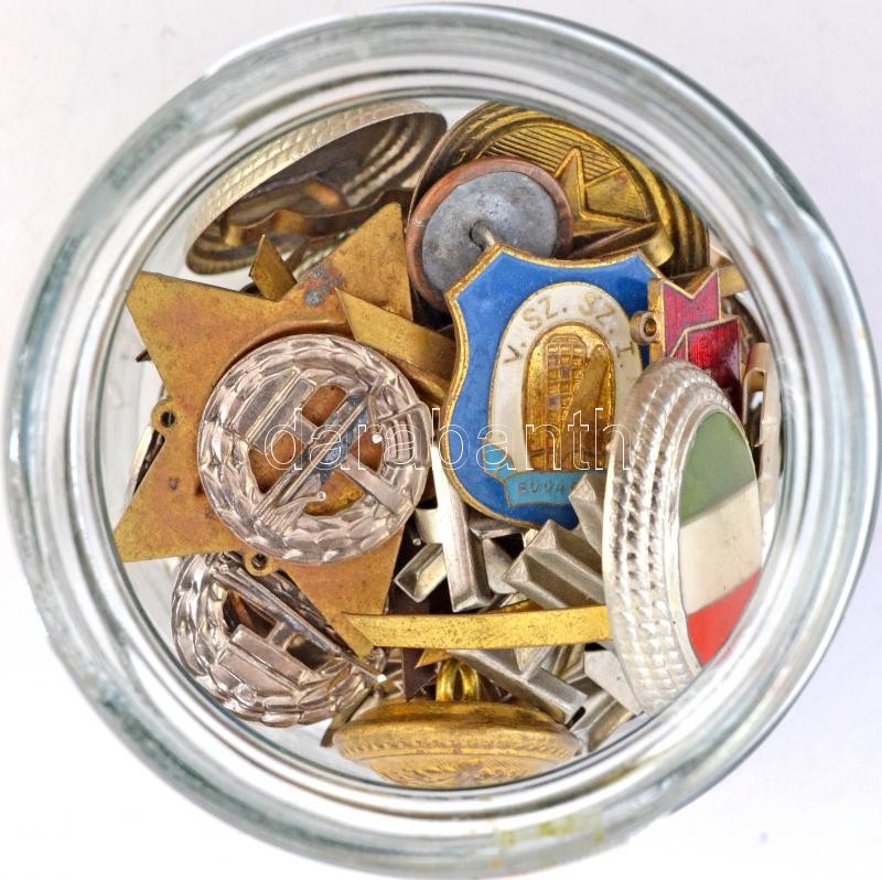 Leírás: Kis befőttesüvegnyi vegyes jelvény, kitűző, gomb és érme tétel, nagyrésze a szocialista időszakból T:vegyes