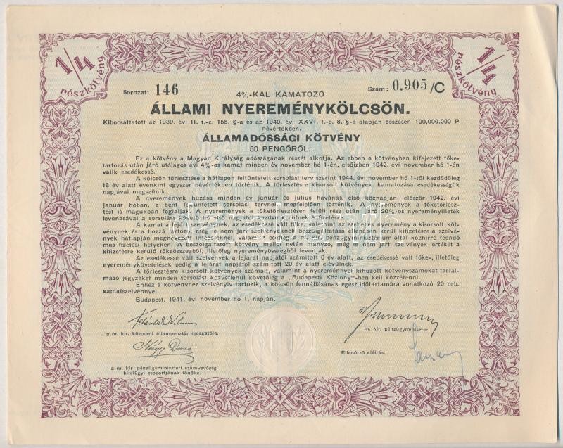 Leírás: Budapest 1941. "4%-kal kamatozó Állami Nyereménykölcsön" államadóssági kötvénye 50P-ről (7x), sorszámkövetők szelvényekkel, szárazpecséttel, vízjeles papíron T:I-,II