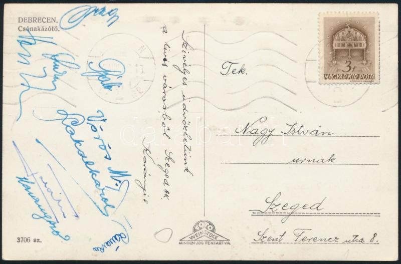 1943 Szegedi AK labdarúgóinak aláírása képeslapon, rajta többek közt Lakat Károly (1920-1988) és Harangozó Sándor (1913-1981) válogatott labdarúgók aláírásai