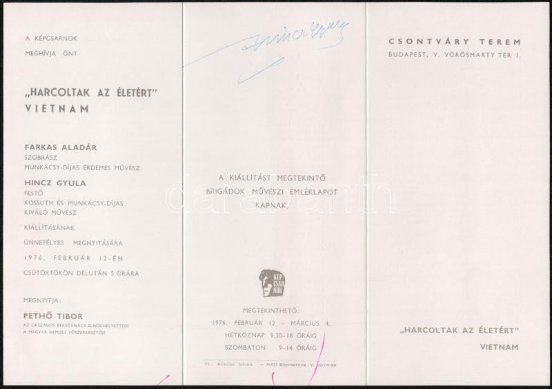 Leírás: Hincz Gyula (1904-1986) aláírása kiállítási meghívón