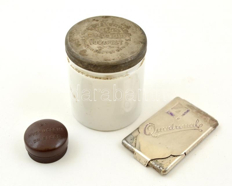 Vegyes gyógyszeres doboz tétel, 3 db, bakelit, porcelán és fém, Dr. Eg... https://www.darabanth.com/hu/296-Gyorsarveres/296.0/Festmeny-mutargy-papirregiseg-egyeb/Bolhapiac~11/Vegyes-gyogyszeres-doboz-tetel-3-db-bakelit-porcelan-es-fem-Dr-Egger-Diana-Gyogyszertar~II1574358