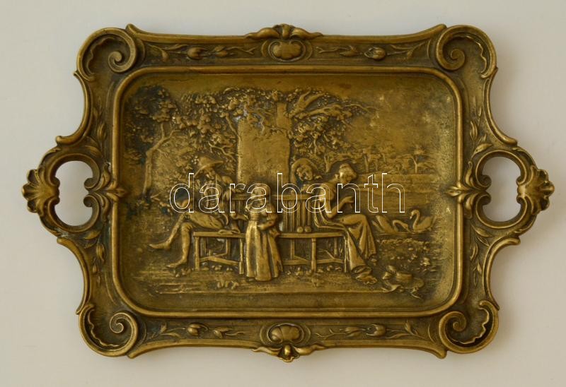 Leírás: cca 1900 réz füles kis tálca (idili park jelenettel), préselt, 13×21 cm