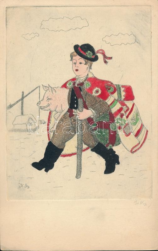 Leírás: B. Koppány György: Malaclopó. Színezett rézkarc papír, jelzett, 13x16 cm