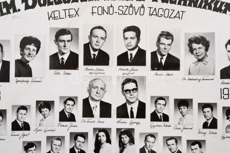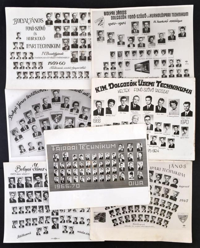 1960-1970 Vegyes tablófotó tétel, 7 db: Bolyai János Fonó-Szövő és Hurkoló Ipari Technikum, K.I.M. Dolgozók Üzemi Technikuma KELTEX Fonó-Szővő Tagozat, D.I.V.A. Faipari Technikum, 24x30 cm.